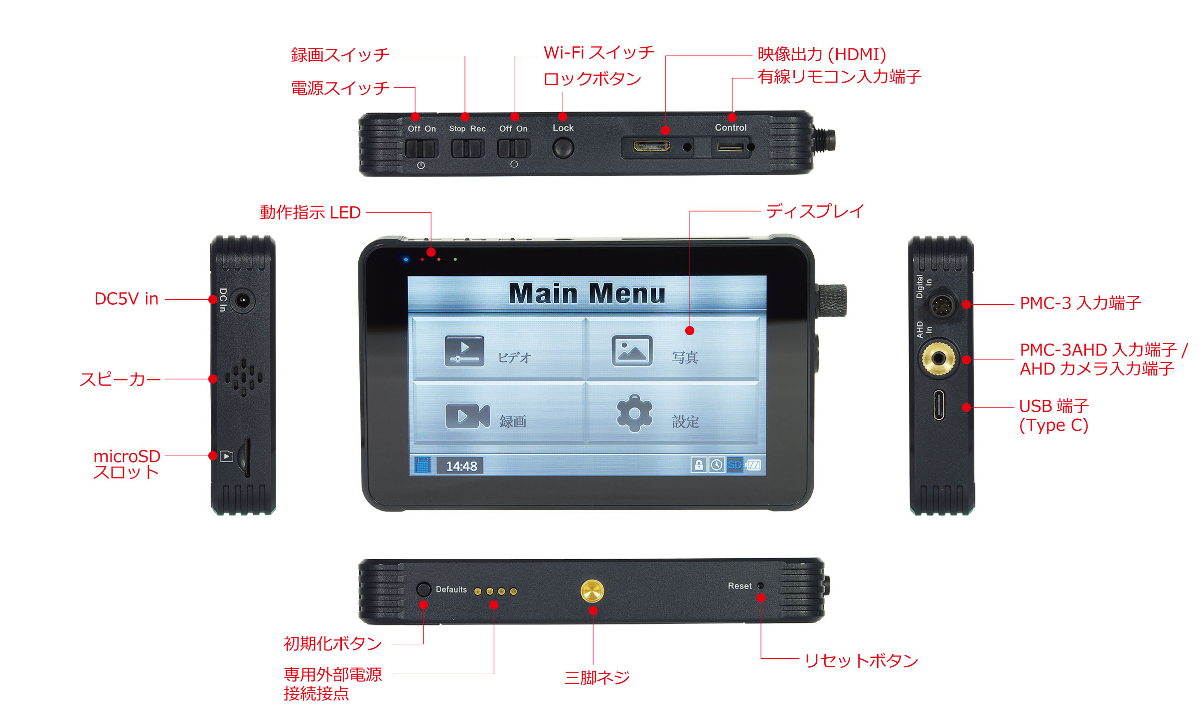 | 入出力端子 | 専用デジタルカメラ「PMC-3」用入力 x 1、 専用AHDカメラ「PMC-3AHD」用入力 (DC5V Max250mA供給)x 1、有線リモコン入力 x 1、HDMI映像出力 x 1、 USB 端子(Type-C) x 1 ※3、 DC5V 電源入力端子 x 1 |