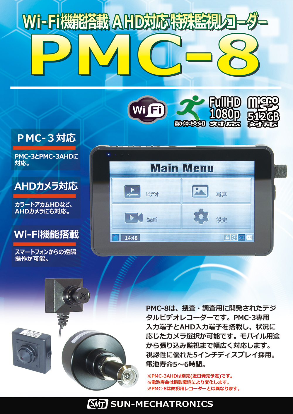 PMC-8は、捜査・調査用に開発されたデジタルビデオレコーダーです。記録媒体にはmicroSDXCを使用します(最大512GB)。カメラ入力はPMC-3専用端子とAHD端子を装備しています。AHD端子には、今回同時発売のPMC-3AHDや200万画素のAHDカメラを接続してご利用いただけます。その他、多様な録画モードや、スマホ等との通信機能を提供。捜査・調査の現場における多彩な撮影シーンに対応します。※本製品は防水・防塵仕様ではございません。