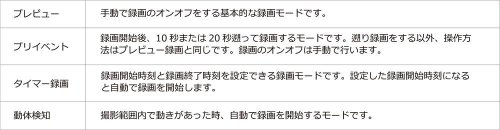 | 録画モード | プレビュー(マニュアル録画)/ プリイベント(遡り録画)/ タイマー録画 / 動体検知 |